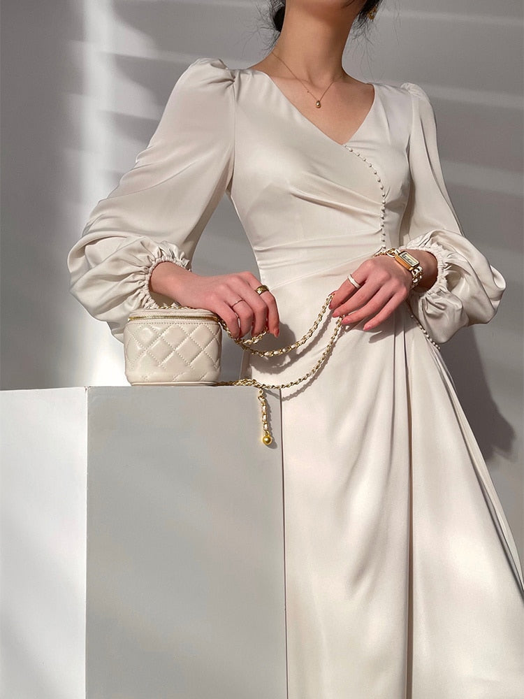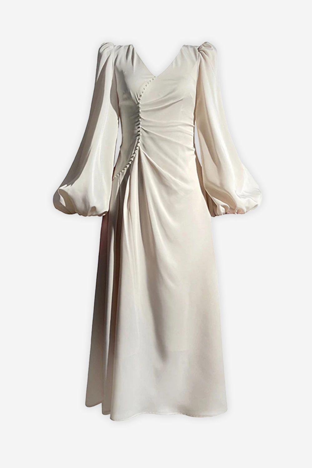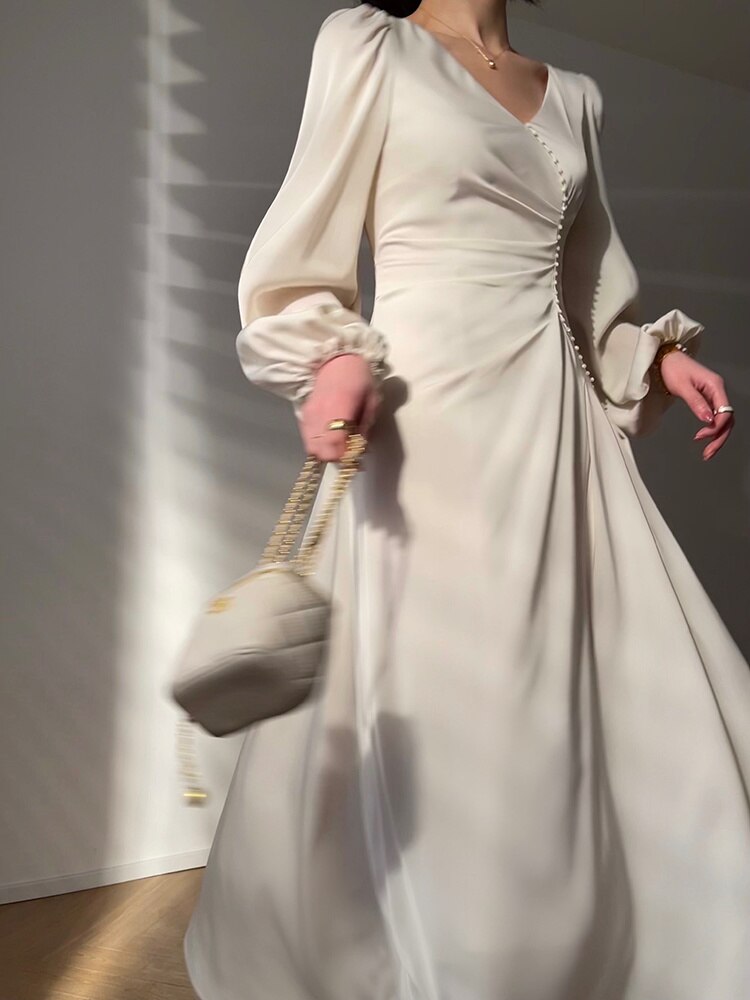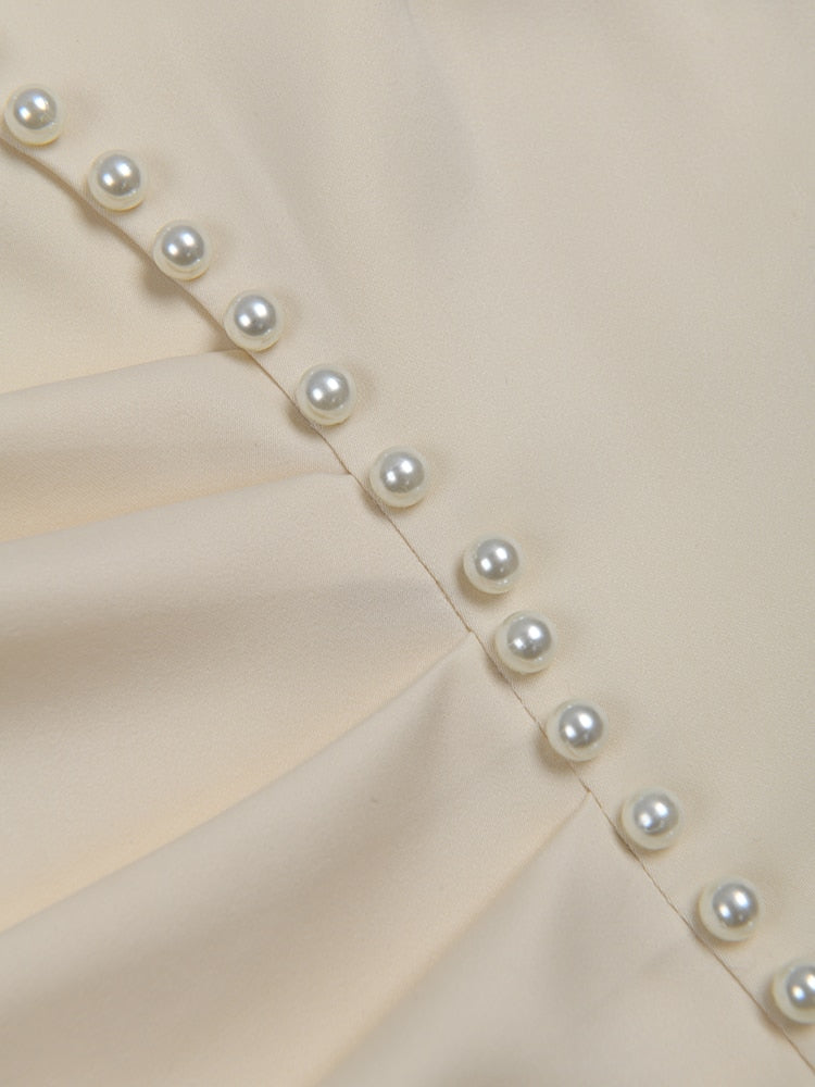 The Fleur features a deep V-neckline that flatters the decolletage, and is made from high-quality white fabric that flows gracefully over the body. The dress is embellished with beautiful pearls, delicately hand-sewn onto the fabric in intricate patterns that catch the light and add a subtle shimmer to the dress. It can be paired with simple accessories to allow the dress to take center stage.