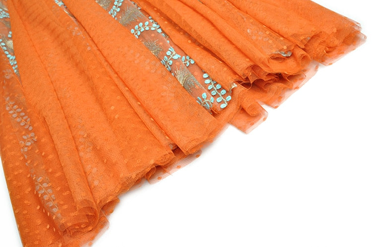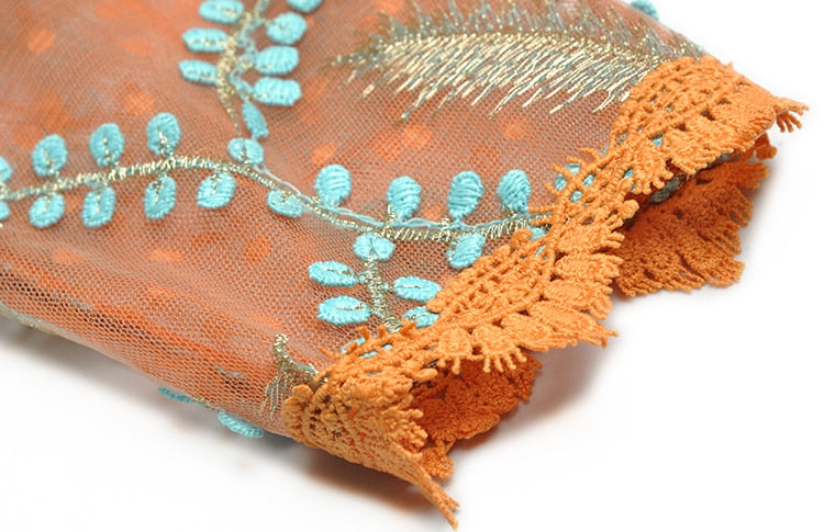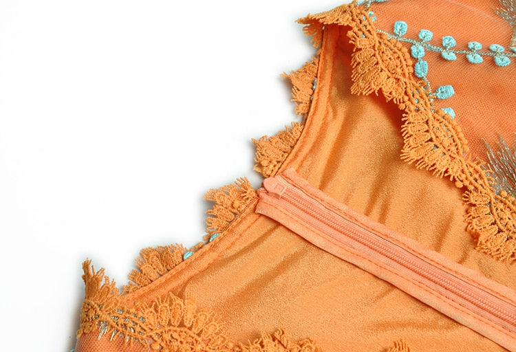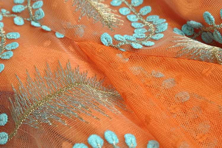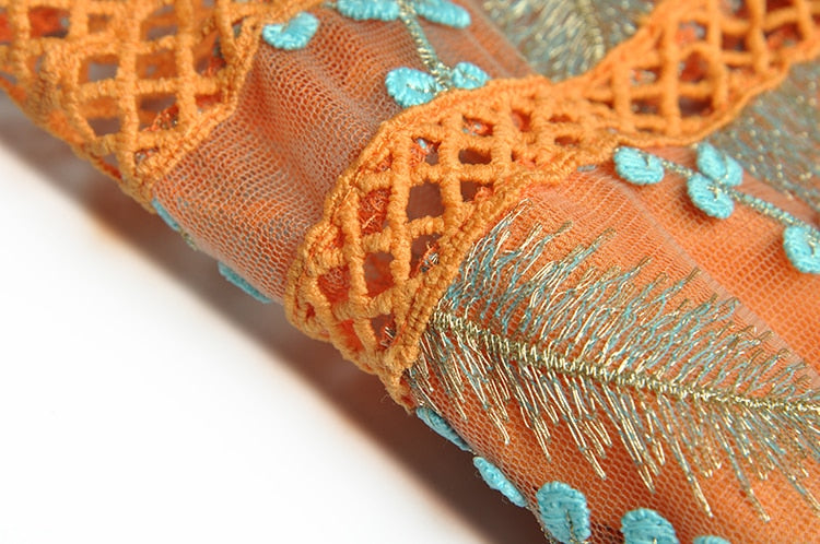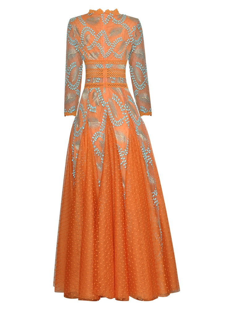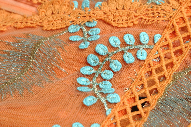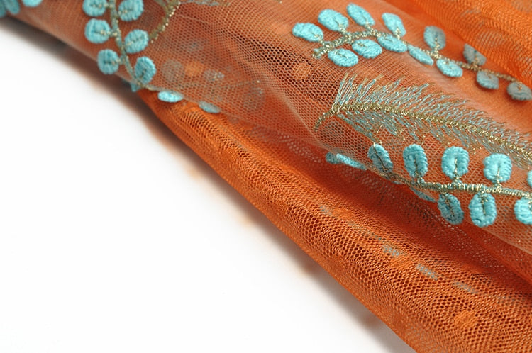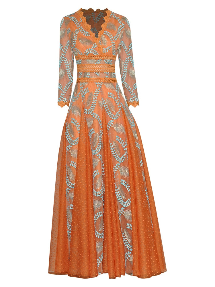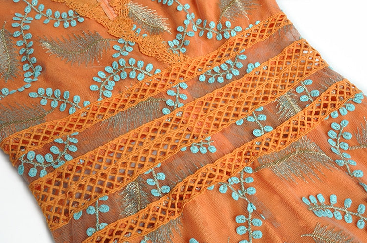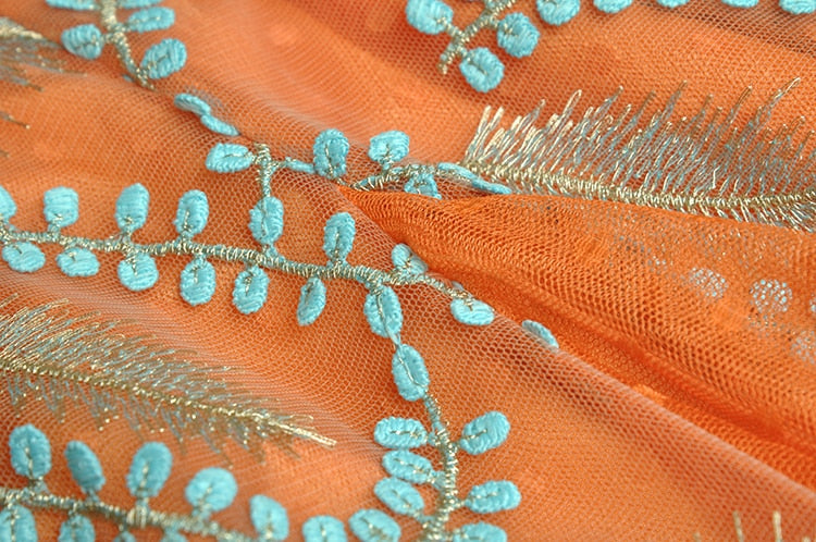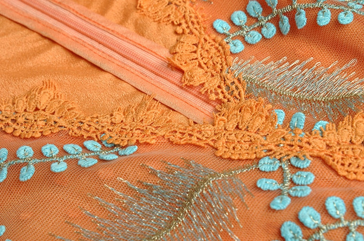 The intricate embroidery of blue leaves on the bodice creates a striking contrast with the bold orange color, while the delicate lace detailing adds a romantic touch. The flowing fabric of the maxi dress creates a beautiful movement as you walk, making it perfect for any special occasion where you want to make a statement. Dress it up with heels and statement jewelry for a formal event, or keep it simple with sandals and a clutch for a more casual occasion.