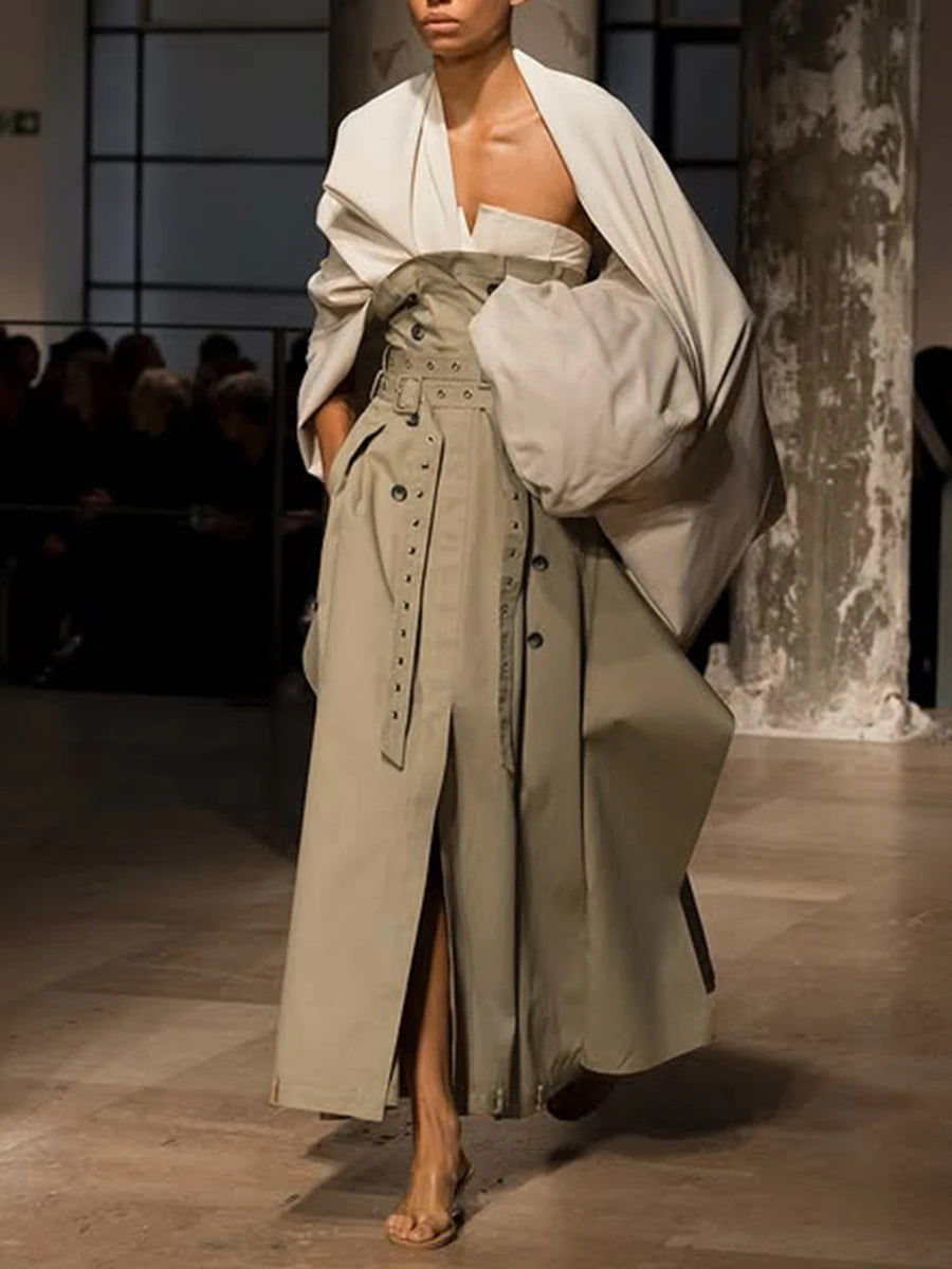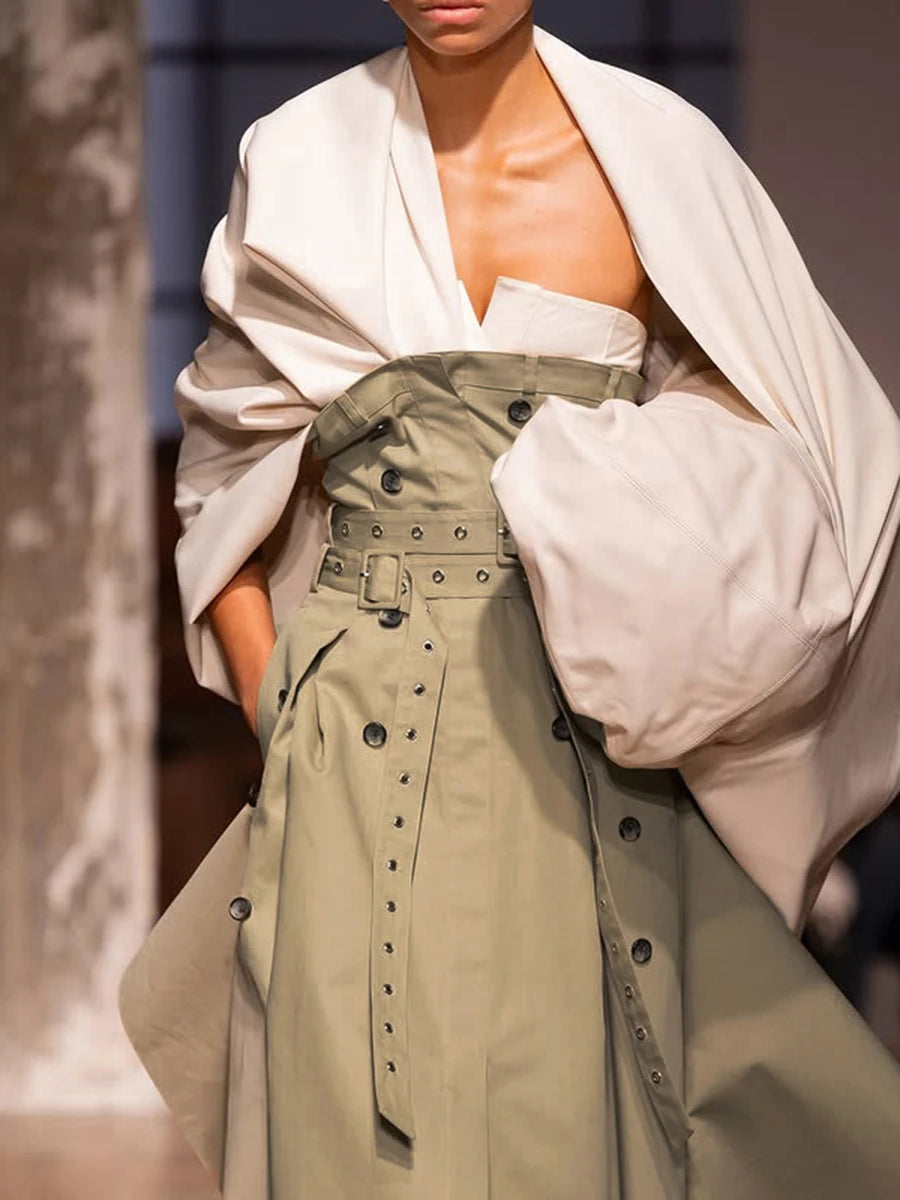 Redefine modern sophistication with the Kaerra Dress. Designed with a structured strapless bodice and belted waist, this piece gives classic trench details a feminine twist. The flared silhouette moves gracefully, striking the perfect balance between strength and softness—ideal for polished days or elevated evenings out.