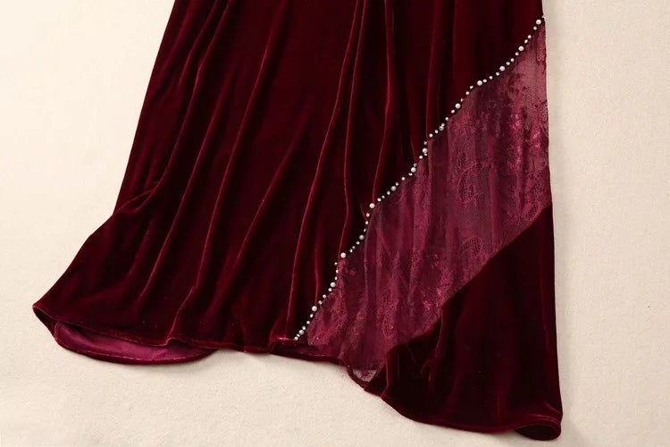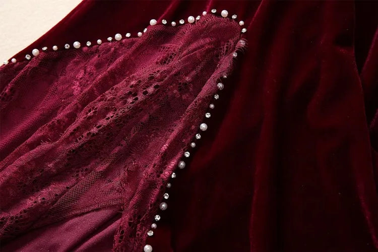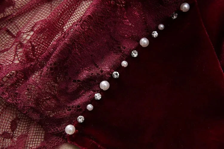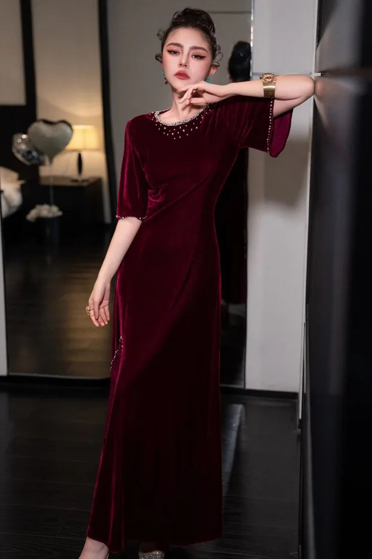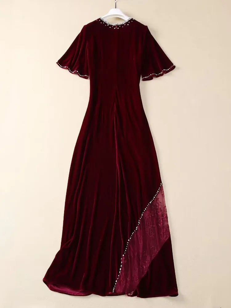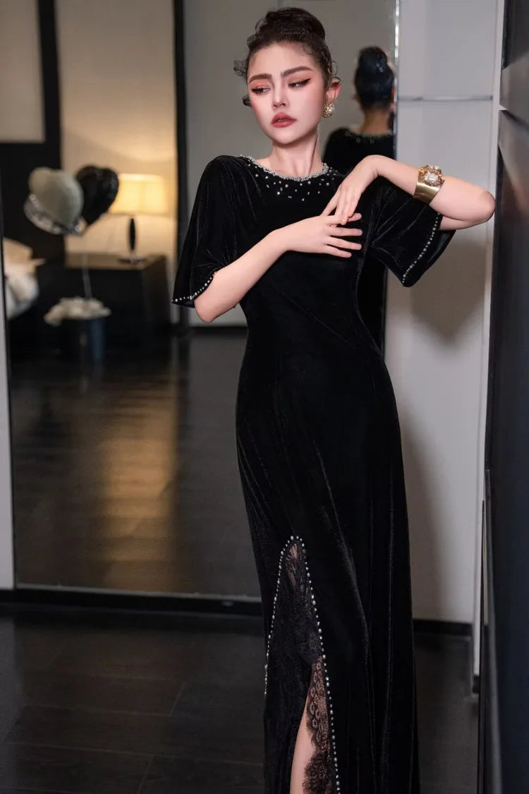 Radiating a soft, ethereal charm, this patchwork appliquéd gown brings depth and artistry to classic eveningwear. The O-neckline and empire waist create an elegant frame, while translucent layers of polyester drift with graceful fluidity. Appliqued details lend subtle texture and a vintage sensibility, making it a refined choice for soirées and formal gatherings that call for understated allure.