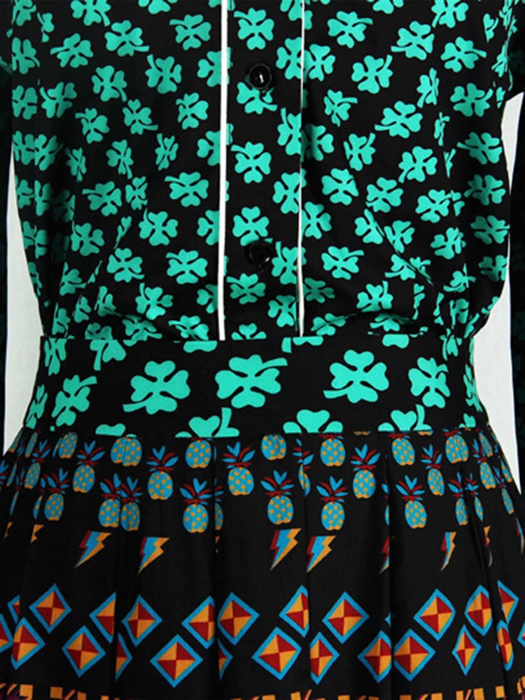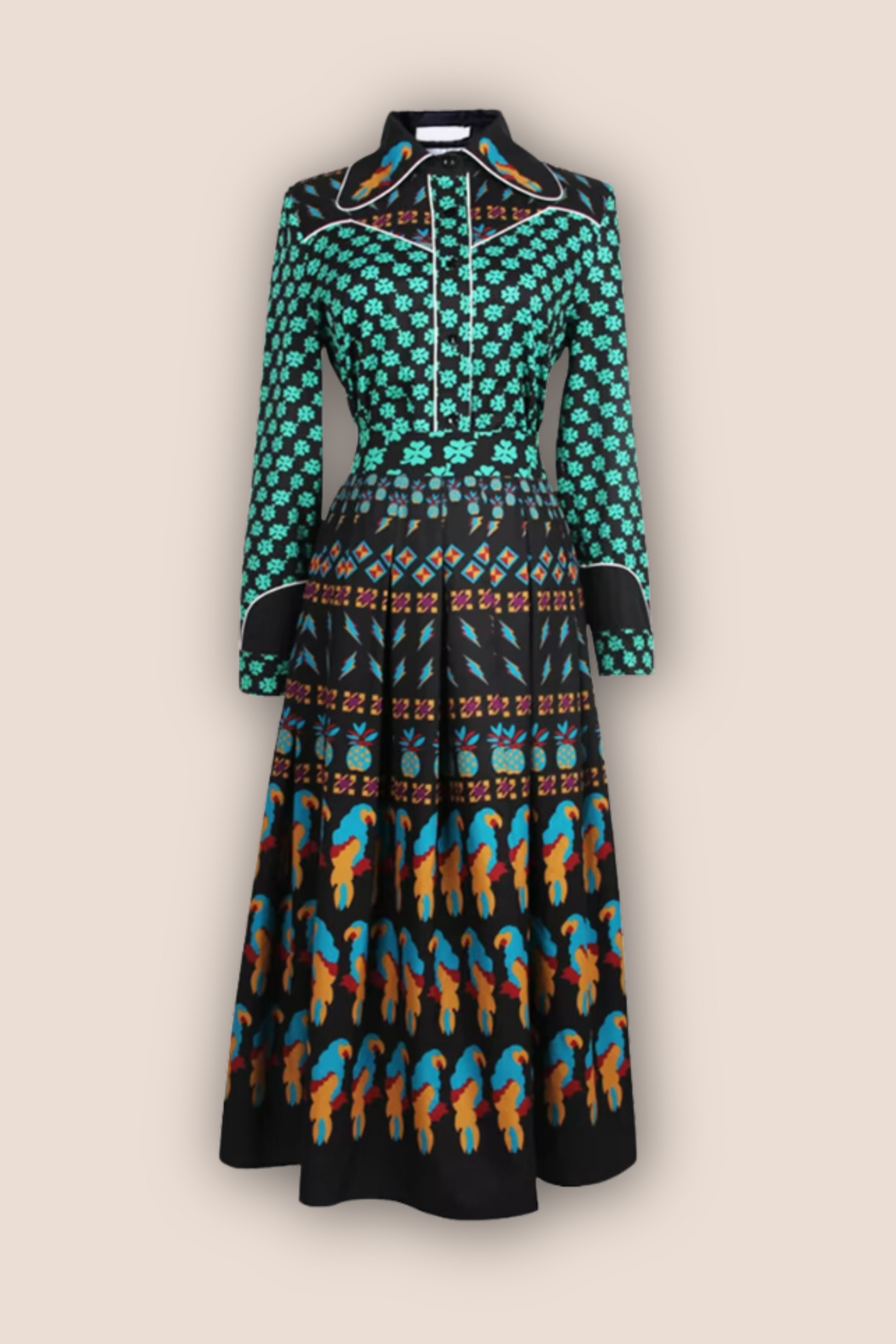 Bauble's 'Kylee' set is so intricately designed with beautiful colors and detail. This polo type top and midi skirt set is cut from breathable fabric in a cinched yet relaxed shape. It is printed with a colorful, beautifully detailed vintage motif that deserves a closer look.