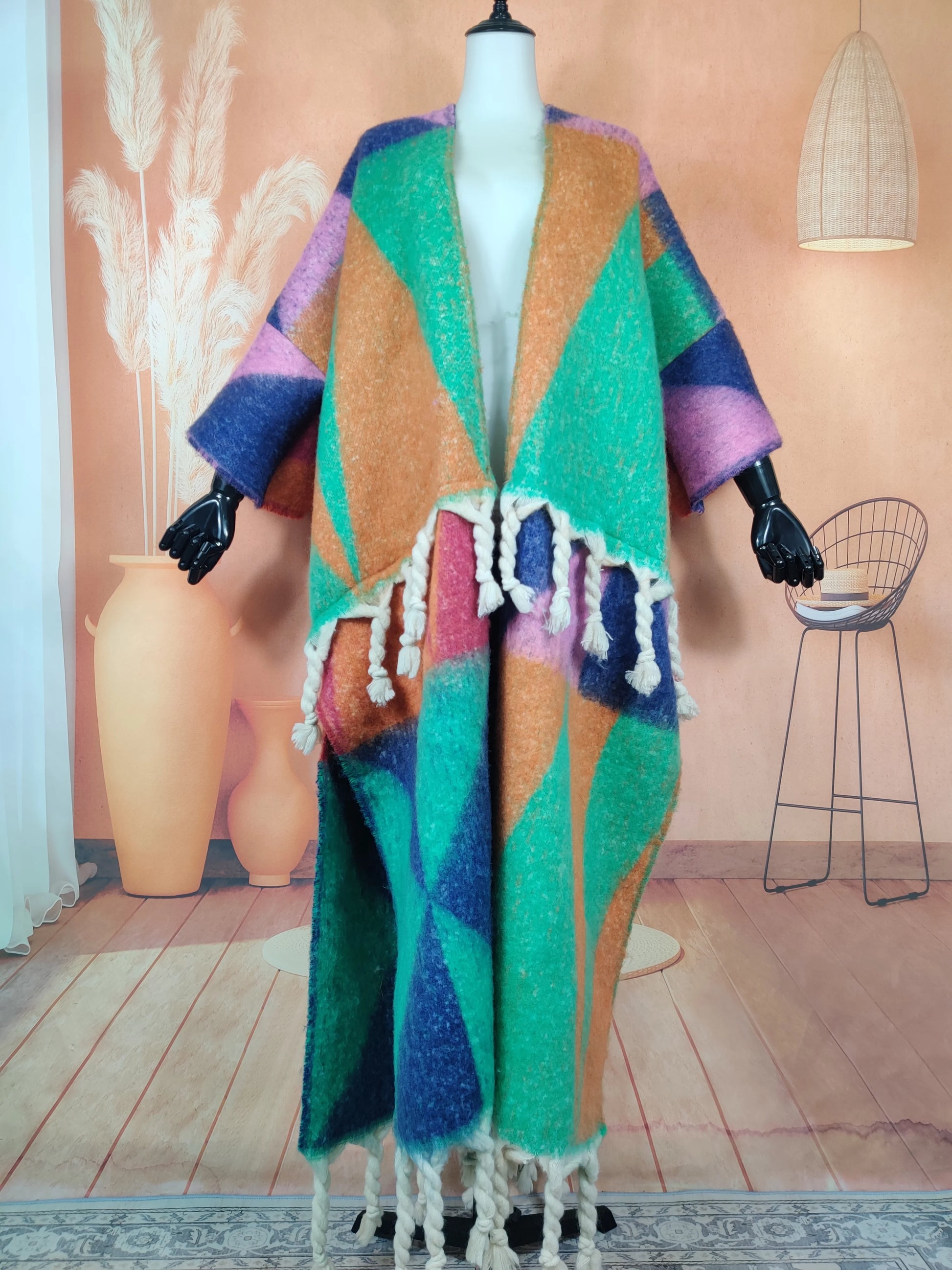 Bauble's 'Maisie' coat is patterned with colorful shapes knitted with a combination of textures and fabrics that add beautiful dimension. It's designed to loosely hug your frame.