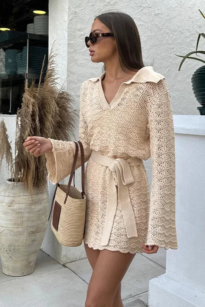 Bauble’s ‘Makayla’ dress is knitted and has a breezy, open finish. The waist is threaded with adjustable ribbon ties, creating the illusion of two separates at first glance. Wear it over a tonal swimsuit when heading from the beach to al fresco lunch.