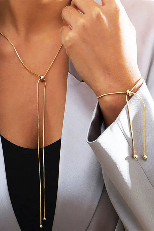 Bauble's 'Meren' Tassel Chain Set is designed to elevate plunging necklines with effortless elegance. Crafted from fine metal, this versatile piece drapes gracefully, ending in two sculptural droplets that add a modern, refined touch.