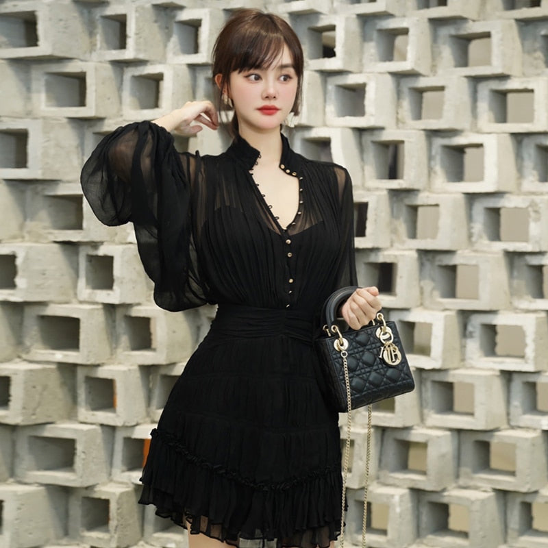 The Temperament Fold Pleated Mini Dress is a stylish and feminine piece with a V-neckline and puff sleeves. It features a flattering high waist and is designed with pleats for a sophisticated touch. The dress is finished with buttons for a classic look, making it perfect for both formal and casual occasions.