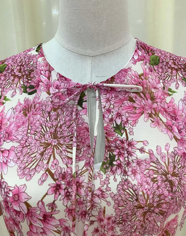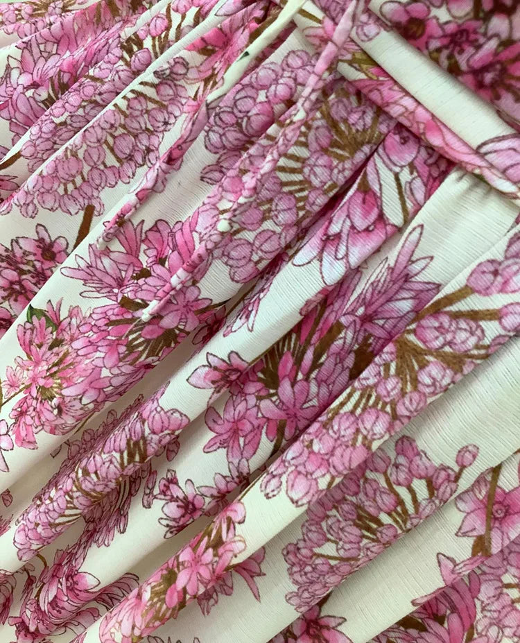 Evoking a sense of refined romance, this floral maxi dress blends vintage charm with contemporary allure. The V-neckline and high waist sculpt an elegant silhouette, while pleated detailing and delicate lace embroidery add depth and texture. Crafted from breathable polyester, it moves beautifully with every step — a perfect choice for spring occasions that call for effortless sophistication.