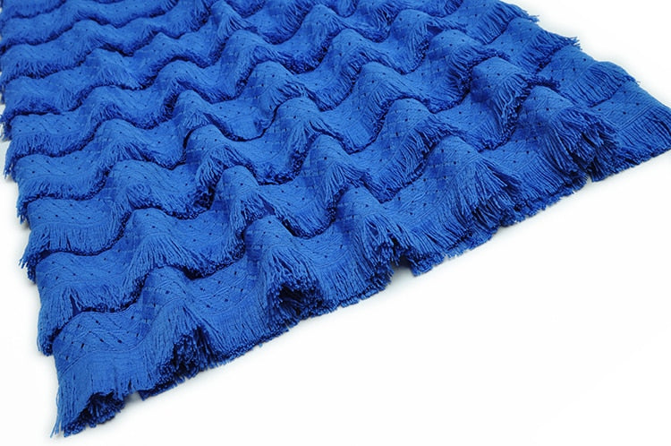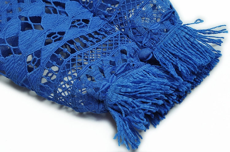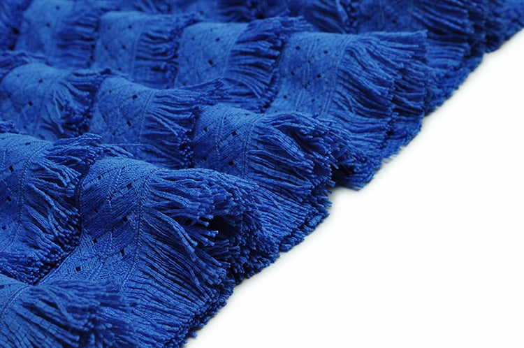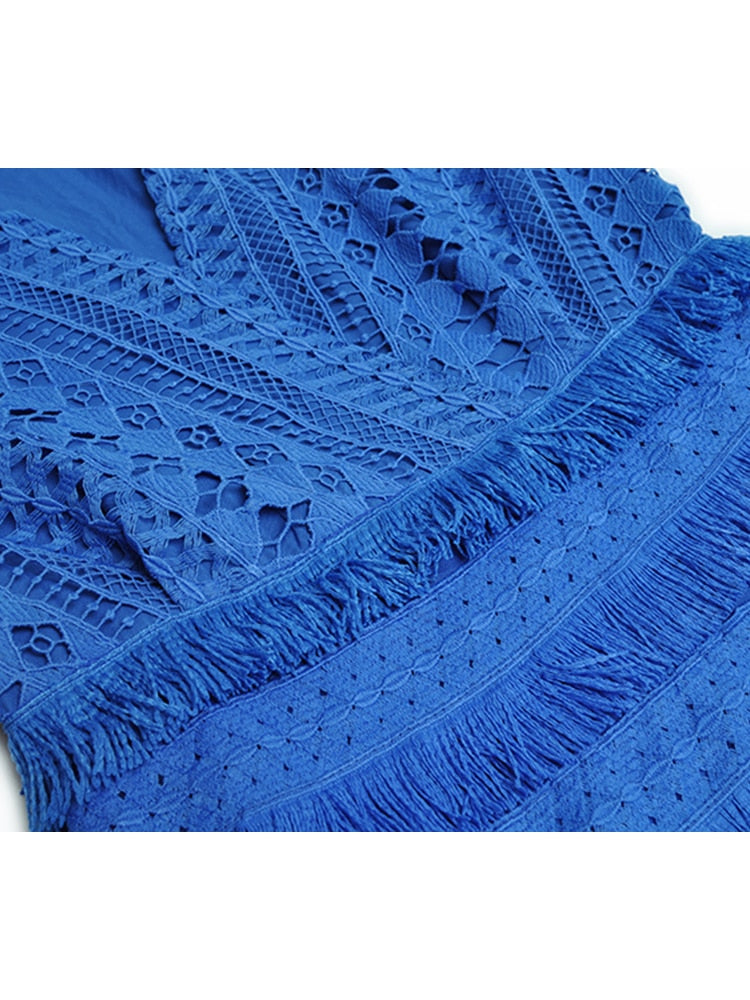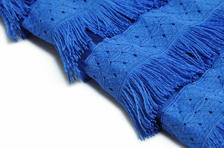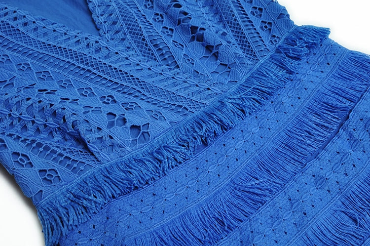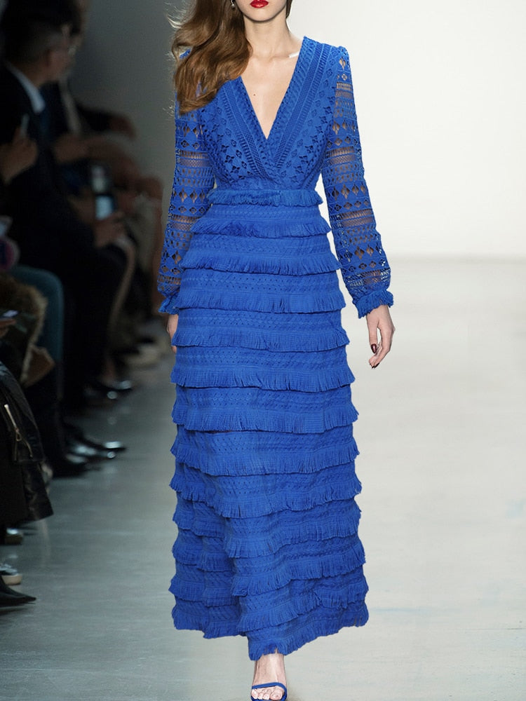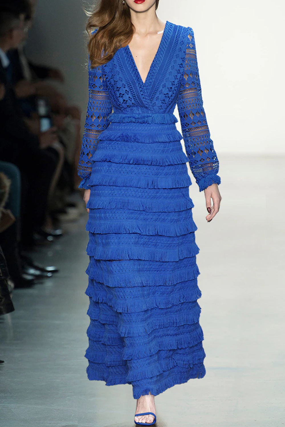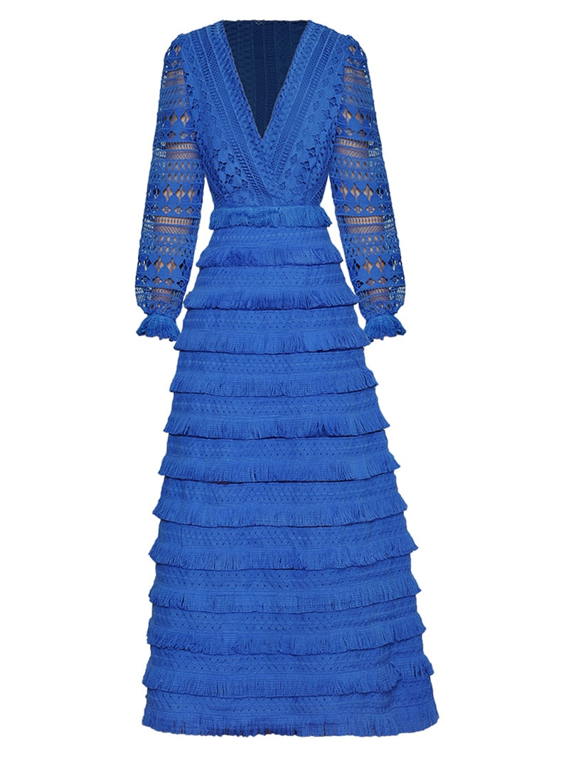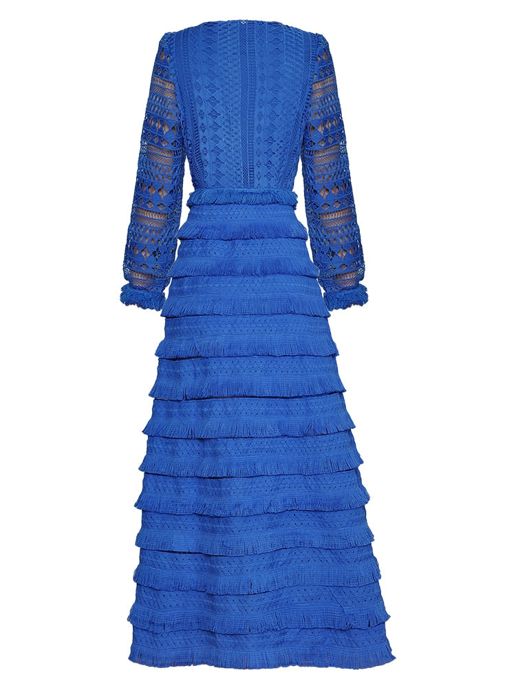 Crafted from a lightweight and breathable fabric, this dress is perfect for warm weather occasions. The tiered tassels add movement and flow to the dress, creating a beautiful and graceful silhouette. With its versatile design and beautiful craftsmanship, this blue maxi dress is a must-have addition to any fashion-forward wardrobe. It's perfect for any occasion, from casual brunches to elegant dinner parties, making it a true investment piece.