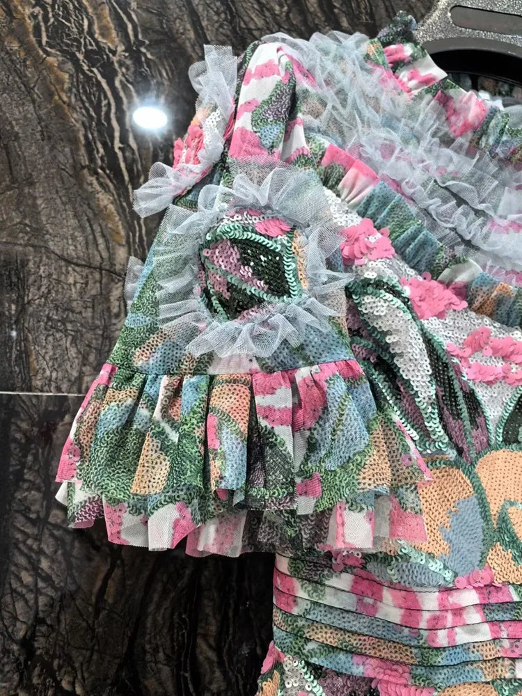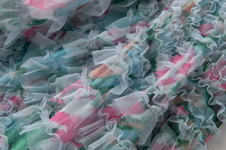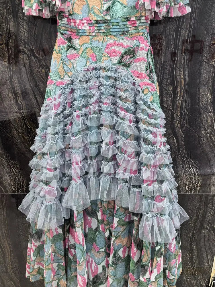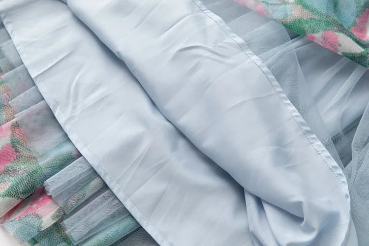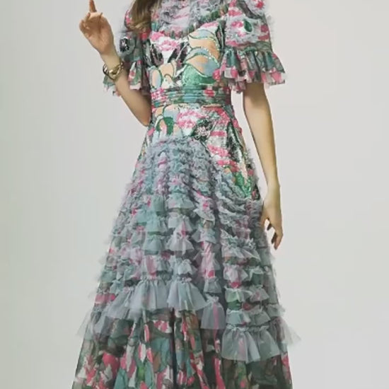 Romantic and refined, this floral maxi dress captures the poetry of springtime dressing. The V-neckline and high waist create a softly elongated shape, while pleated panels and lace embroidery lend delicate dimension. Crafted from lightweight polyester that drapes fluidly, it’s an effortlessly elegant choice for evening gatherings and garden celebrations alike.