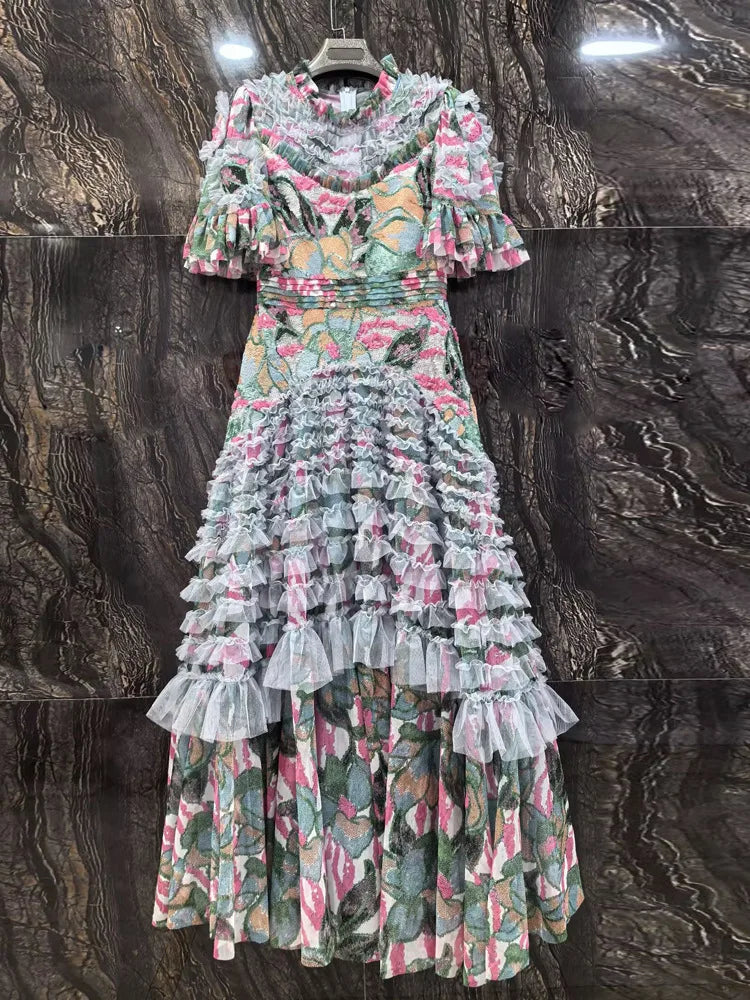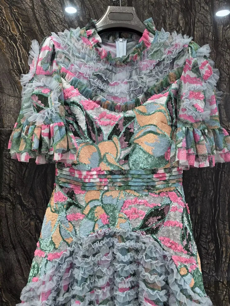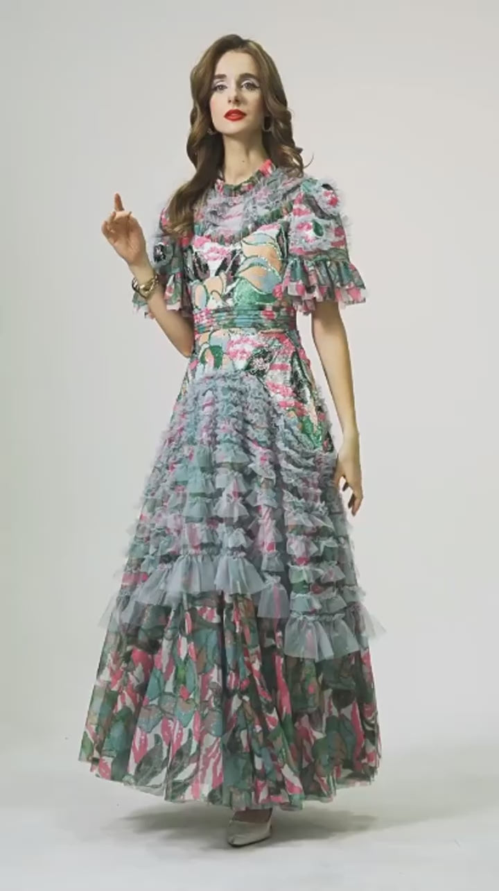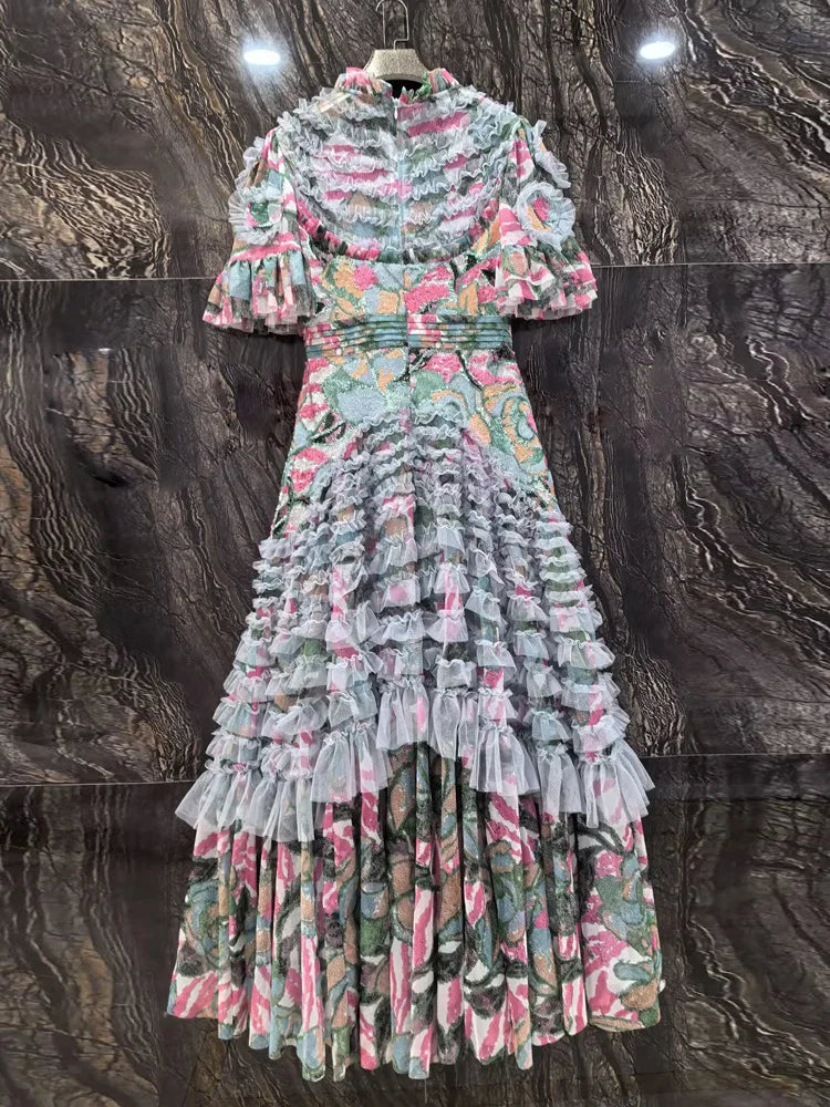 Sleeve Style: Regular | Dresses Length: Maxi Standard | Silhouette: Ball Gown | Printing Methods: Digital printing | Waistline: Empire | Built-in Bra: NO | Style: Party | Weaving method: knitted | Logo/graphic design: embroidered | Feature: anti-wrinkle | Collar: Stand Collar | Clothing Type: Ball Gown | Season: Spring | Neckline: stand | Fashion Element: Vintage | Sleeve Length(cm): Short | Decoration: Appliques | Pattern Type: Print |