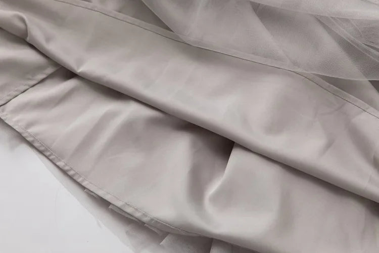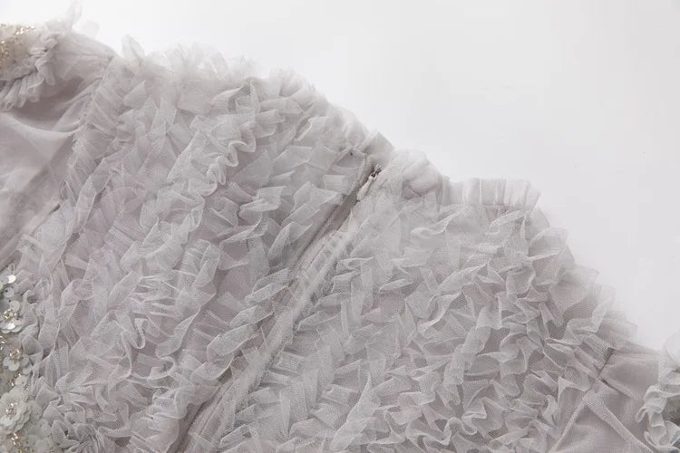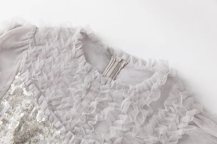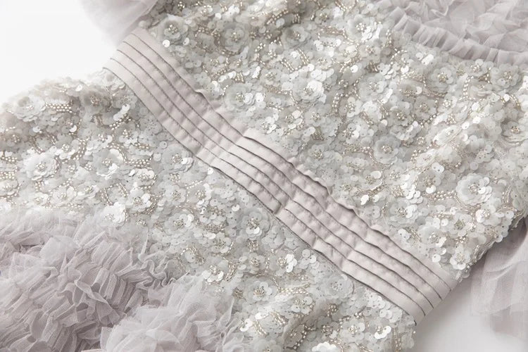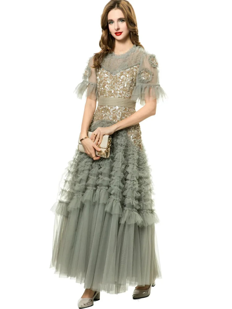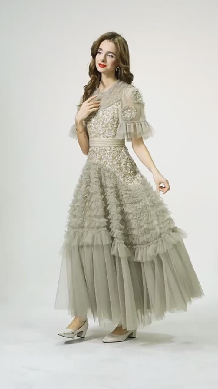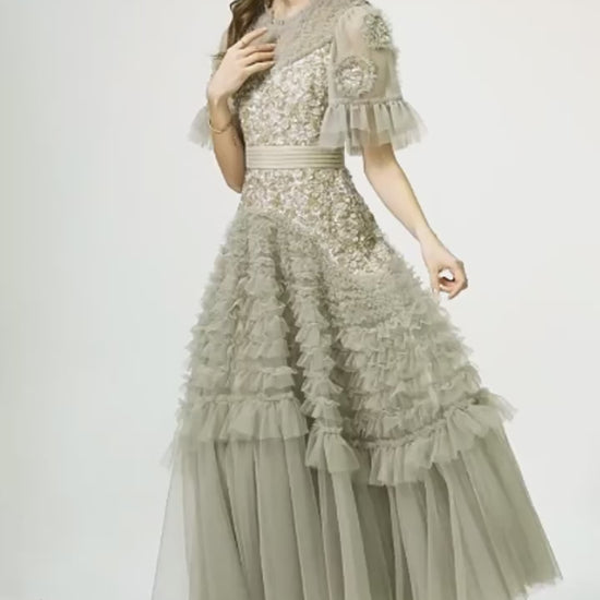 This ethereal gown blends glamour with graceful detail. The bodice shimmers with delicate sequins, cascading into layers of soft tulle ruffles that create a romantic A-line silhouette. Sheer flutter sleeves and a cinched waist add a refined, feminine charm, making it a perfect choice for evening soirées or formal celebrations.