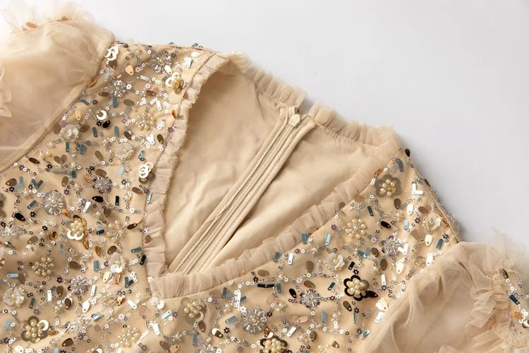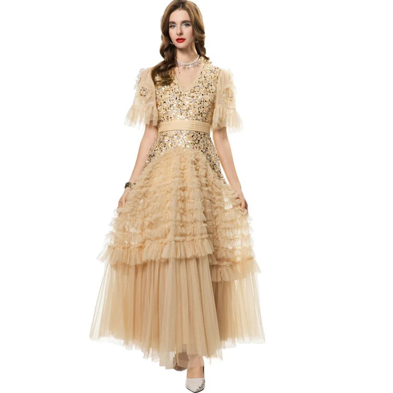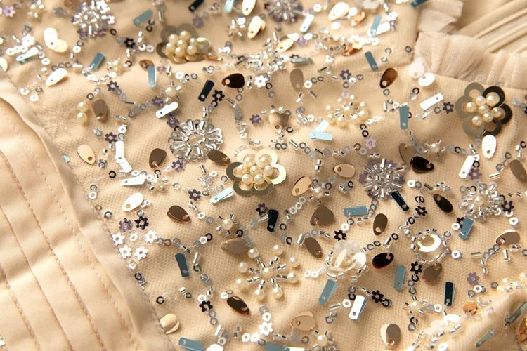Sleeve Style: Regular | Dresses Length: Maxi Standard | Silhouette: Ball Gown | Waistline: Empire | Built-in Bra: NO | Style: Party | Weaving method: knitted | Logo/graphic design: embroidered | Technics: Beaded | Feature: anti-wrinkle | Collar: V-neck | Clothing Type: Ball Gown | Season: Summer | Neckline: V-neck | Fashion Element: Vintage | Sleeve Length(cm): Short | Decoration: Beading | Pattern Type: Patchwork |