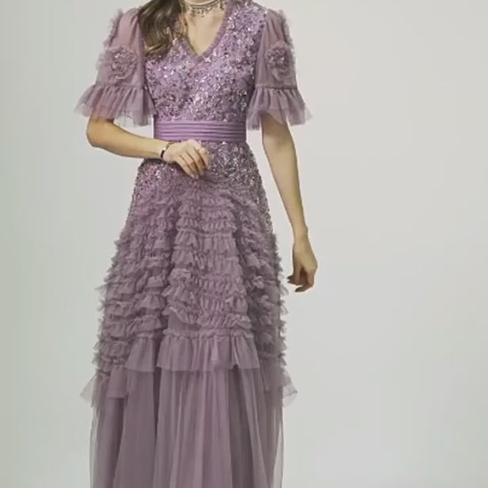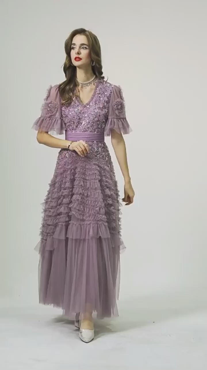 A vision of modern romance, this gown is adorned with intricate hand-embellished sequins and floral appliqués that catch the light beautifully. The soft orchid hue enhances its feminine allure, while the tiered tulle skirt adds airy movement and texture. A gently defined waistband and flutter sleeves complete the silhouette, offering a refined yet whimsical feel—perfect for evening affairs or elegant celebrations.