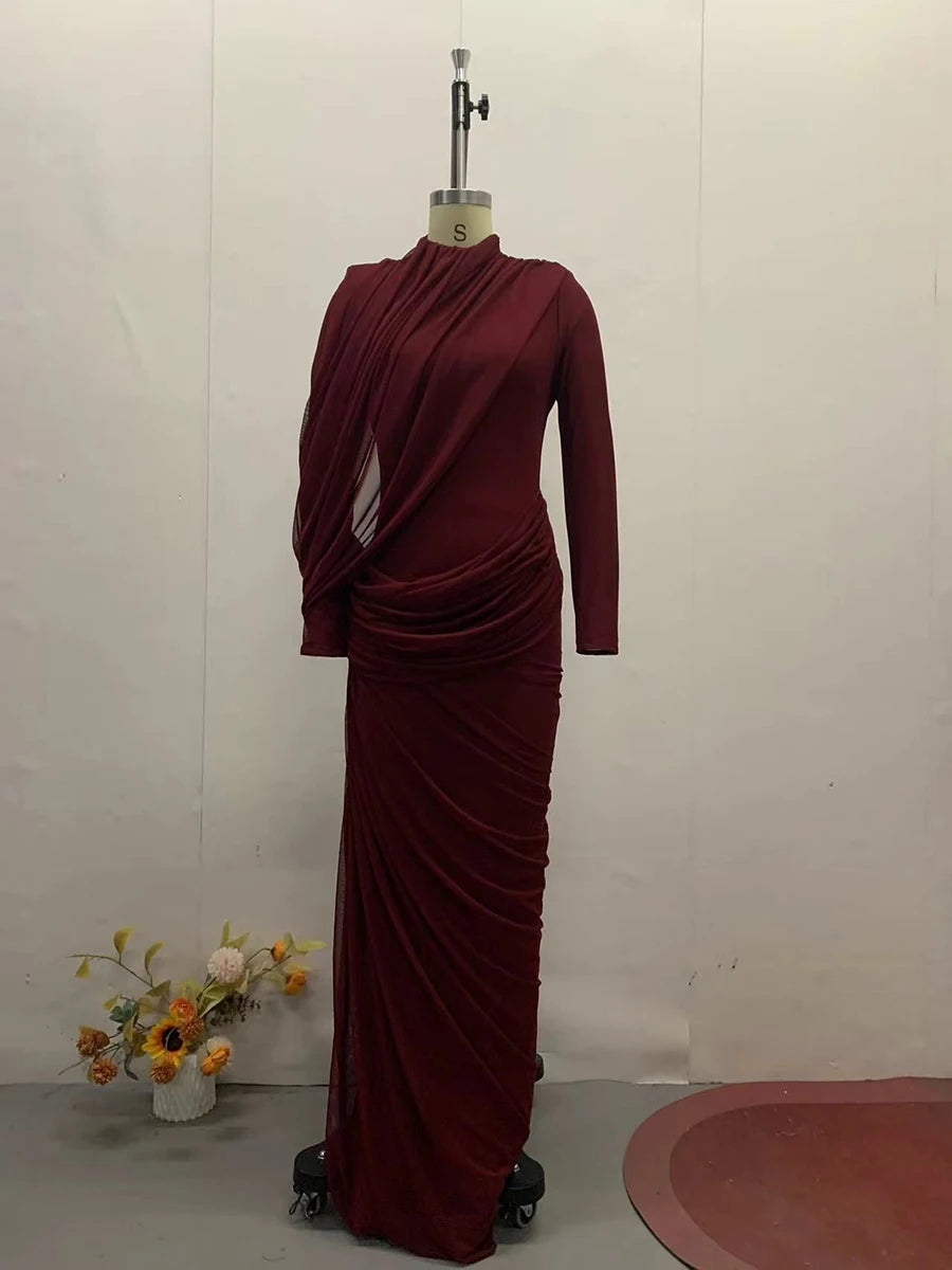 Bauble Buy's Velisse Dress is draped for a statuesque, floor-sweeping silhouette and rendered in a vibrant olive-green hue. It's designed with an elegant high neckline and intricate, asymmetric ruching that flows across the body to create a flattering, liquid-like effect. It features a slightly slim shape with long sleeves—style yours with sculptural gold jewelry to complement the striking tone.