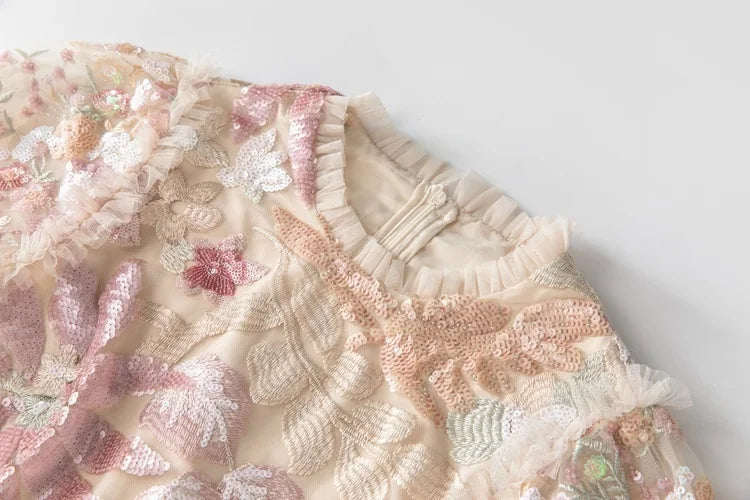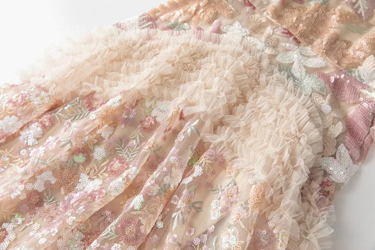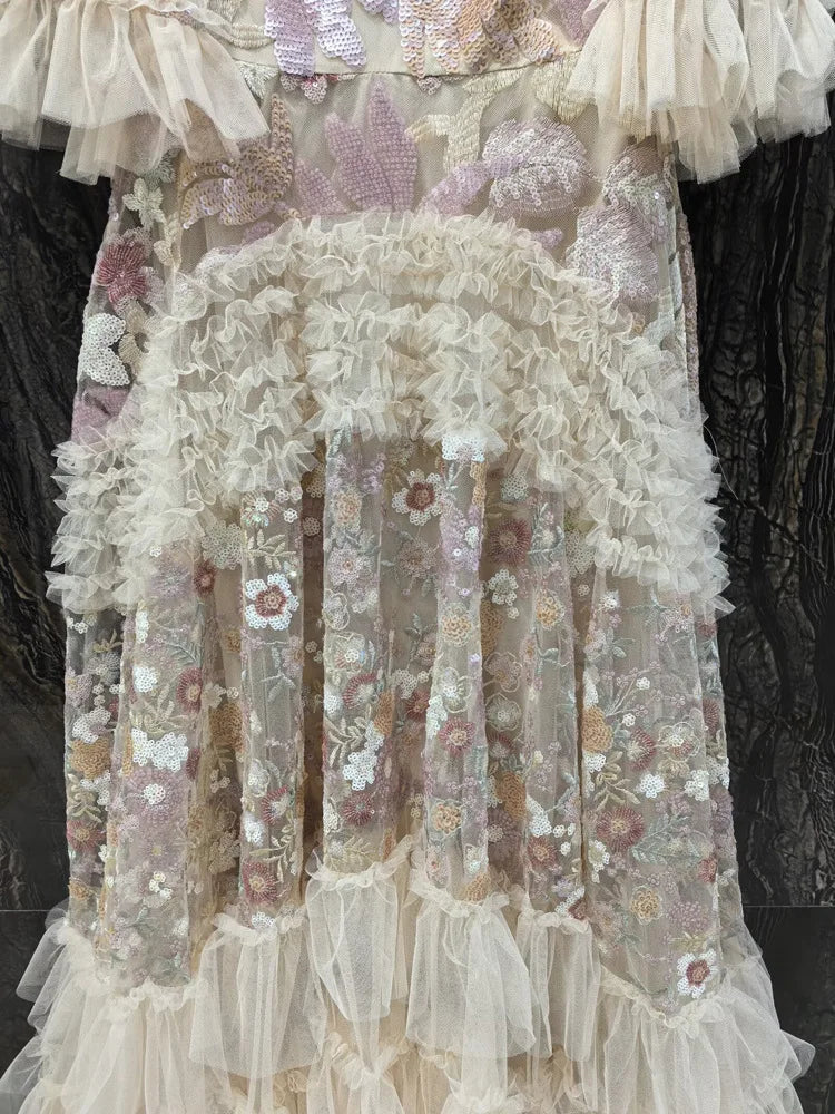 An absolute showstopper for autumn soirées, this maxi dress commands attention with its voluminous Ball Gown silhouette. The comfortable woven polyester fabric drapes flawlessly from an empire waist, maintaining an anti-wrinkle polish. It features a high stand collar and charming short flare sleeves, beautifully detailed with embroidery and beading that enhance the floral pattern, ensuring a sophisticated, vintage-inspired look.